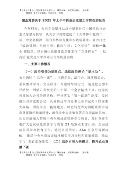 【七哥公文】2025年:国企党委关于2025年上半年抓基层党建工作情况的报告+更多免费公文+VX:QiGeGongWen2024