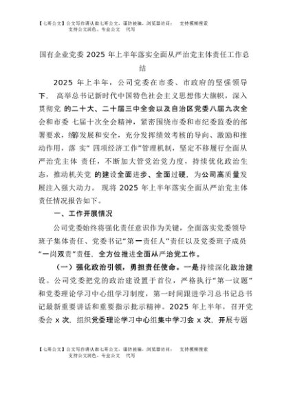 【七哥公文】2025年:国企公司党委2025年上半年落实全面从严治党主体责任工作总结4400字+更多免费公文+VX:QiGeGongWen2024
