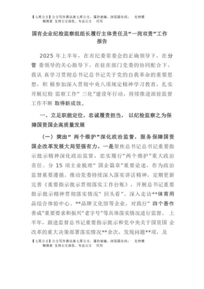 【七哥公文】2025年:国有企业纪检监察组组长履行主体责任及“一岗双责”工作报告+更多免费公文+VX:QiGeGongWen2024