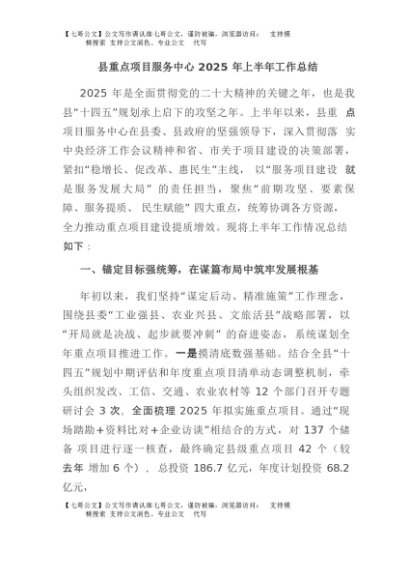 / 【七哥公文】2025年:县重点项目服务中心2025年上半年工作总结+更多免费公文+VX:QiGeGongWen2024