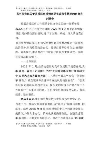 【七哥公文】2025年:县科协党组关于县委巡察反馈意见整改落实情况的自查自纠报告+更多免费公文+VX:QiGeGongWen2024