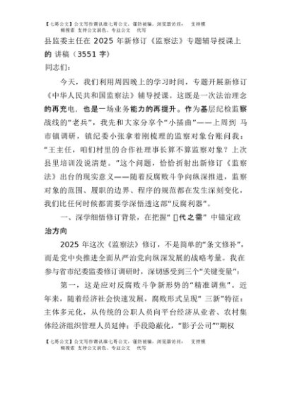 【七哥公文】2025年:县监委主任在2025年新修订《监察法》专题辅导授课上的讲稿(3551字)+更多免费公文+VX:QiGeGongWen2024