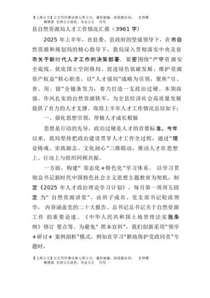 / 【七哥公文】2025年:县自然资源局人才工作情况汇报(3961字)+更多免费公文+VX:QiGeGongWen2024