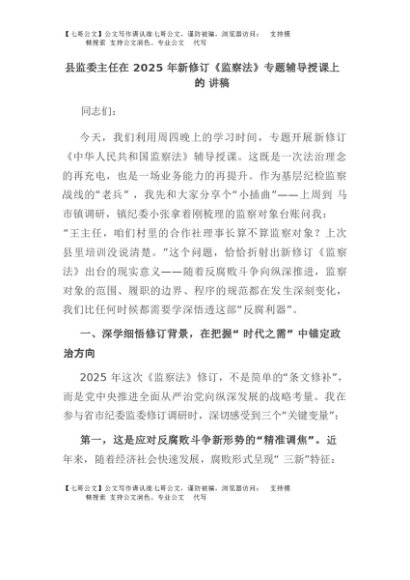 【七哥公文】2025年:县监委主任在2025年新修订《监察法》专题辅导授课上的讲稿+更多免费公文+VX:QiGeGongWen2024