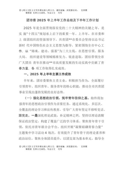 / 【七哥公文】2025年:团市委2025年上半年工作总结及下半年工作计划+更多免费公文+VX:QiGeGongWen2024