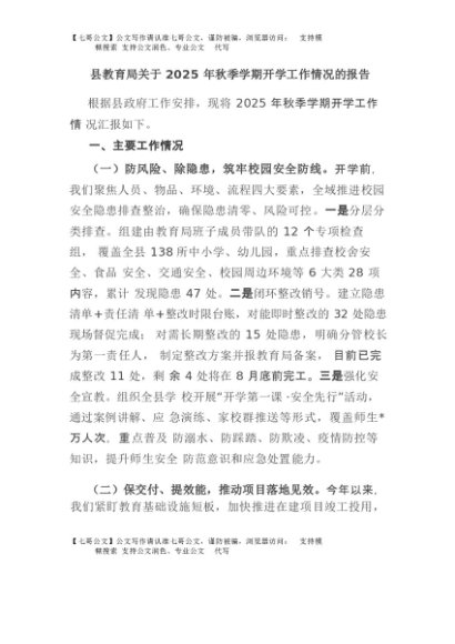 【七哥公文】2025年:县教育局关于2025年秋季学期开学工作情况的报告+更多免费公文+VX:QiGeGongWen2024