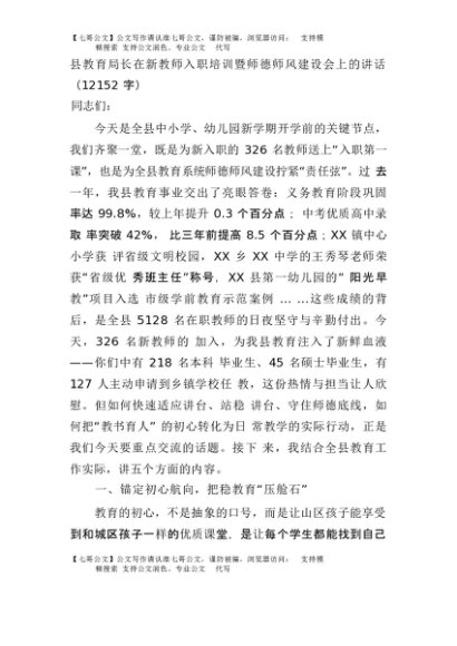 【七哥公文】2025年:县教育局长在新教师入职培训暨师德师风建设会上的讲话(12152字)+更多免费公文+VX:QiGeGongWen2024