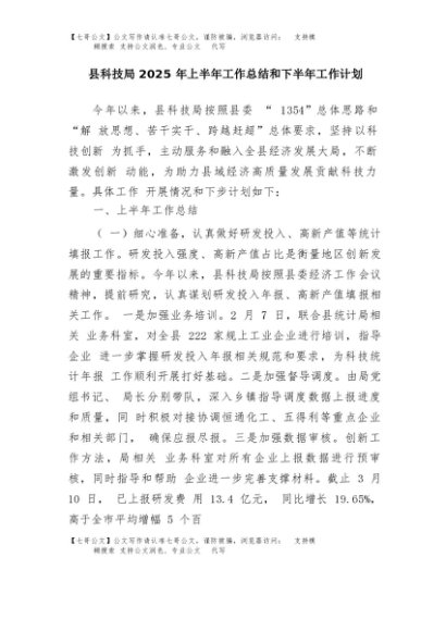 【七哥公文】2025年:县科技局2025年上半年工作总结和下半年工作计划+更多免费公文+VX:QiGeGongWen2024