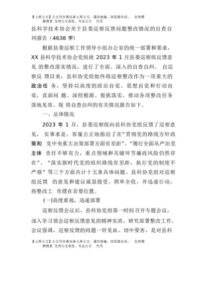 【七哥公文】2025年:县科学技术协会关于县委巡察反馈问题整改情况的自查自纠报告(4638字)+更多免费公文+VX:QiGeGongWen2024