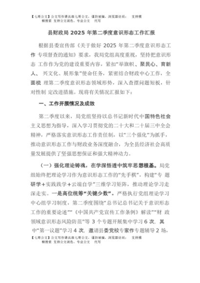 / 【七哥公文】2025年:县财政局2025年第二季度意识形态工作汇报+更多免费公文+VX:QiGeGongWen2024