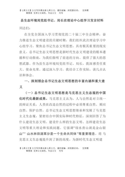 【七哥公文】2025年:县生态环境局党组书记、局长在理论中心组学习发言材料+更多免费公文+VX:QiGeGongWen2024