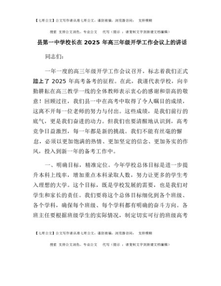 【七哥公文】2025年:县第一中学校长在2025年高三年级开学工作会议上的讲话+更多免费公文+VX:QiGeGongWen2024