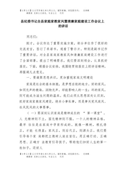 【七哥公文】2025年:县纪委书记全县家庭家教家风暨清廉家庭建设工作会议上的讲话+更多免费公文+VX:QiGeGongWen2024