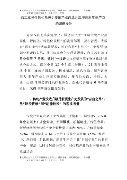 【七哥公文】2025年:县工业和信息化局关于传统产业改造升级培育新质生产力的调研报告+更多免费公文+VX:QiGeGongWen2024