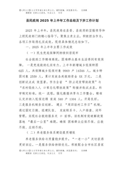 / 【七哥公文】2025年:县民政局2025年上半年工作总结及下步工作计划+更多免费公文+VX:QiGeGongWen2024