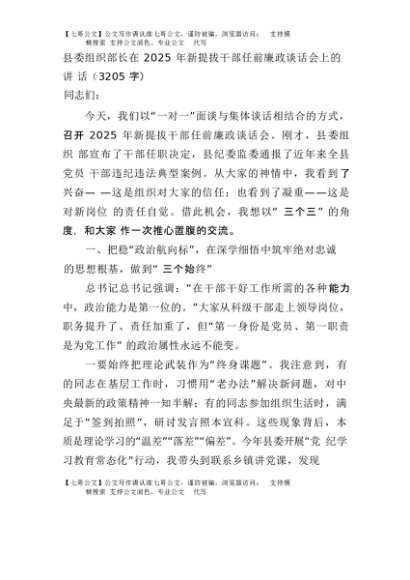 【七哥公文】2025年:县委组织部长在2025年新提拔干部任前廉政谈话会上的讲话(3205字)+更多免费公文+VX:QiGeGongWen2024