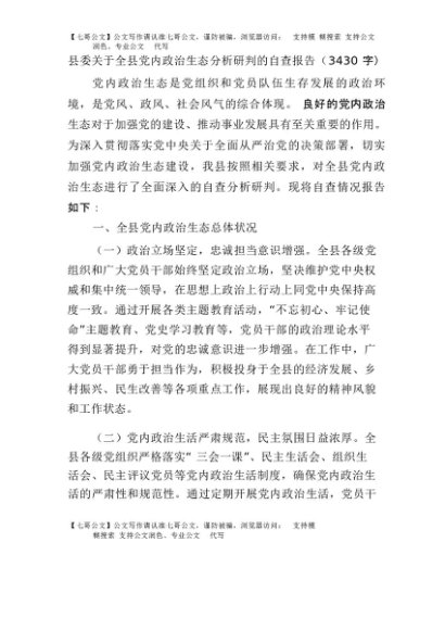 【七哥公文】2025年:县委关于全县党内政治生态分析研判的自查报告(3430字)+更多免费公文+VX:QiGeGongWen2024
