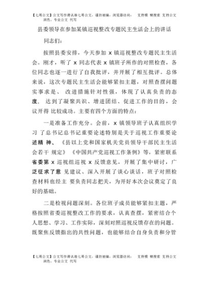【七哥公文】2025年:县委领导在参加某镇巡视整改专题民主生活会上的讲话+更多免费公文+VX:QiGeGongWen2024