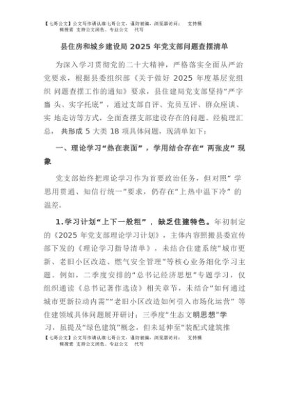 / 【七哥公文】2025年:县住房和城乡建设局2025年党支部问题查摆清单+更多免费公文+VX:QiGeGongWen2024