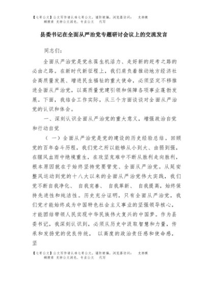 / 【七哥公文】2025年:县委书记在全面从严治党专题研讨会议上的交流发言+更多免费公文+VX:QiGeGongWen2024