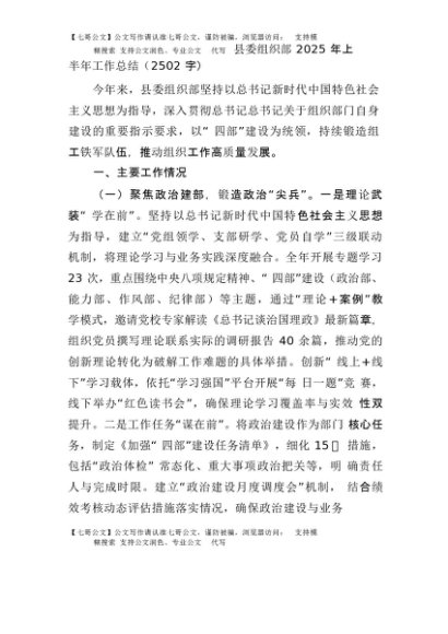 【七哥公文】2025年:县委组织部2025年上半年工作总结(2502字)+更多免费公文+VX:QiGeGongWen2024