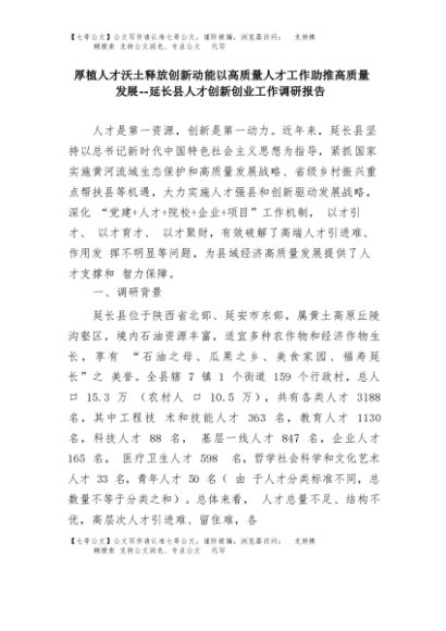 【七哥公文】2025年:厚植人才沃土释放创新动能 以高质量人才工作助推高质量发展--延长县人才创新创业工作调研报告+更多免费公文+VX:QiGeGongWen2024