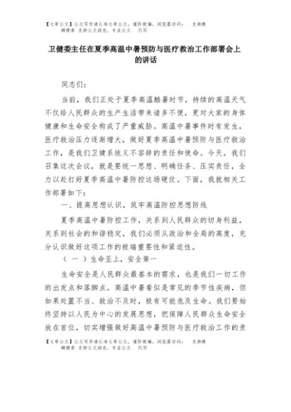 【七哥公文】2025年:卫健委主任在夏季高温中暑预防与医疗救治工作部署会上的讲话+更多免费公文+VX:QiGeGongWen2024