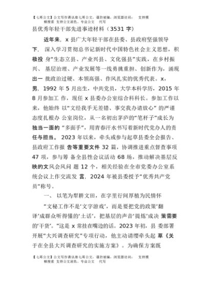 / 【七哥公文】2025年:县优秀年轻干部先进事迹材料(3531字)+更多免费公文+VX:QiGeGongWen2024
