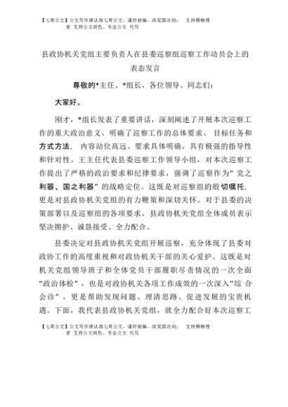 【七哥公文】2025年:县政协机关党组主要负责人在县委巡察组巡察工作动员会上的表态发言+更多免费公文+VX:QiGeGongWen2024