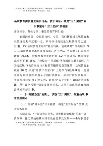 【七哥公文】2025年:县域教育高质量发展研讨会,校长讲话:锚定 “五个突破” 强引擎 坚守 “三个坚持” 筑根基+更多免费公文+VX:QiGeGongWen2024