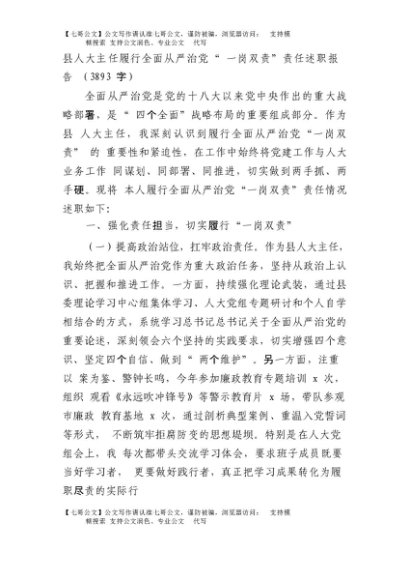 【七哥公文】2025年:县人大主任履行全面从严治党“一岗双责”责任述职报告(3893字)+更多免费公文+VX:QiGeGongWen2024
