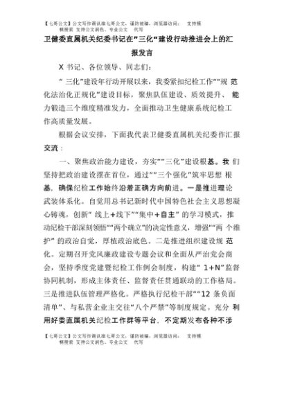 【七哥公文】2025年:卫健委直属机关纪委书记在”三化“建设行动推进会上的汇报发言+更多免费公文+VX:QiGeGongWen2024