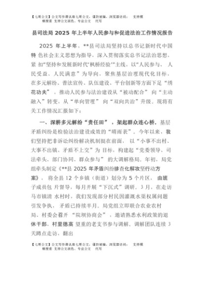 【七哥公文】2025年:县司法局2025年上半年人民参与和促进法治工作情况报告+更多免费公文+VX:QiGeGongWen2024