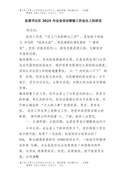 / 【七哥公文】2025年:县委书记在2025年全县信访维稳工作会议上的讲话+更多免费公文+VX:QiGeGongWen2024