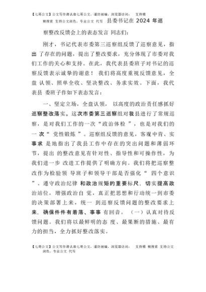 / 【七哥公文】2025年:县委书记在2024年巡察整改反馈会上的表态发言+更多免费公文+VX:QiGeGongWen2024