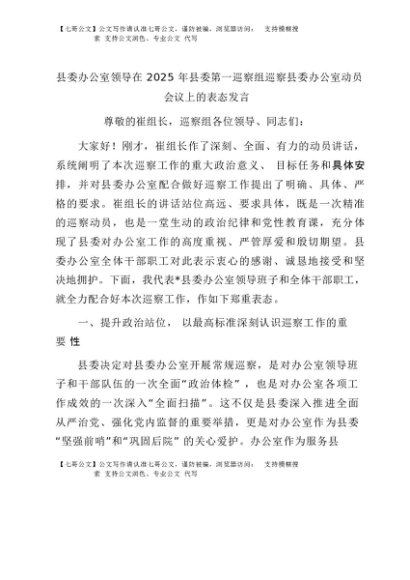 【七哥公文】2025年:县委办公室领导在2025年县委第一巡察组巡察县委办公室动员会议上的表态发言+更多免费公文+VX:QiGeGongWen2024