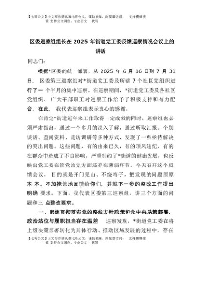 【七哥公文】2025年:区委巡察组组长在2025年街道党工委反馈巡察情况会议上的讲话+更多免费公文+VX:QiGeGongWen2024