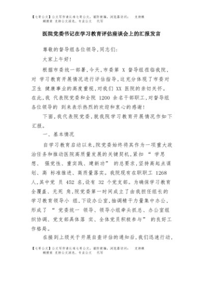 / 【七哥公文】2025年:医院党委书记在学习教育评估座谈会上的汇报发言+更多免费公文+VX:QiGeGongWen2024
