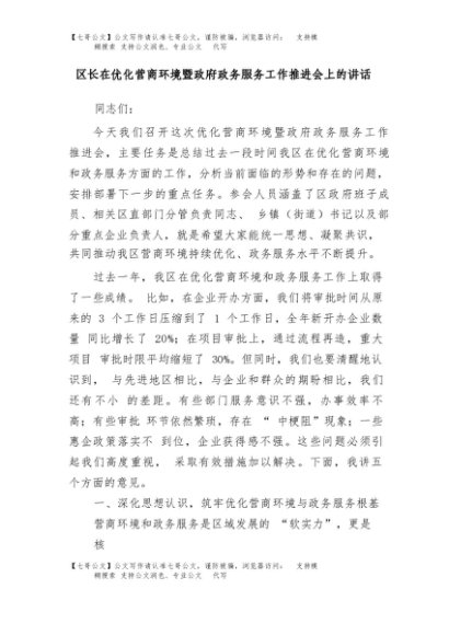 【七哥公文】2025年:区长在优化营商环境暨政府政务服务工作推进会上的讲话+更多免费公文+VX:QiGeGongWen2024