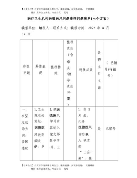 【七哥公文】2025年:医疗卫生机构医德医风问题查摆问题清单(七个方面)(表格)+更多免费公文+VX:QiGeGongWen2024
