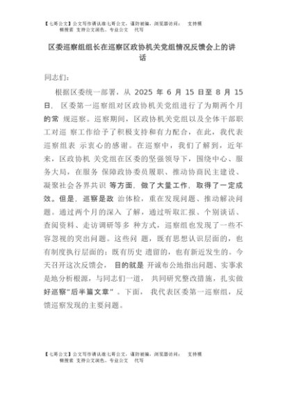 【七哥公文】2025年:区委巡察组组长在巡察区政协机关党组情况反馈会上的讲话+更多免费公文+VX:QiGeGongWen2024