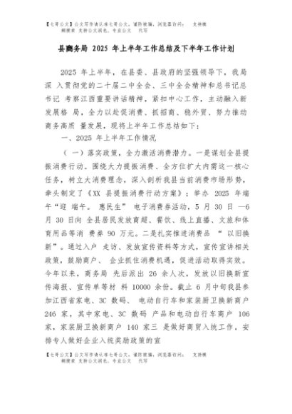 【七哥公文】2025年:县商务局2025年上半年工作总结及下半年工作计划+更多免费公文+VX:QiGeGongWen2024
