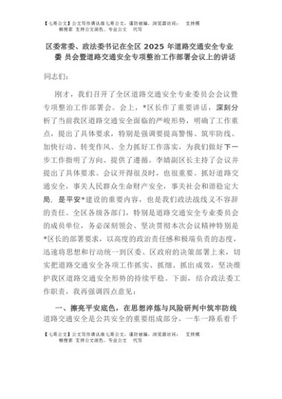 【七哥公文】2025年:区委常委、政法委书记在全区2025年道路交通安全专业委员会暨道路交通安全专项整治工作部署会议上的讲话+更多免费公文+VX:QiGeGongWen2024