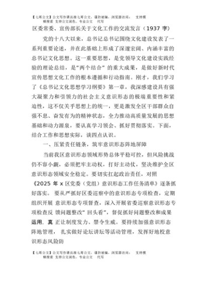 【七哥公文】2025年:区委常委、宣传部长关于文化工作的交流发言(1937字)+更多免费公文+VX:QiGeGongWen2024