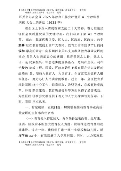 【七哥公文】2025年:区委书记在全区2025年教育工作会议暨第41个教师节庆祝大会上的讲话(3633字)+更多免费公文+VX:QiGeGongWen2024
