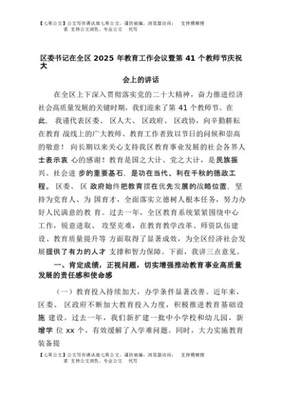 【七哥公文】2025年:区委书记在全区2025年教育工作会议暨第41个教师节庆祝大会上的讲话+更多免费公文+VX:QiGeGongWen2024