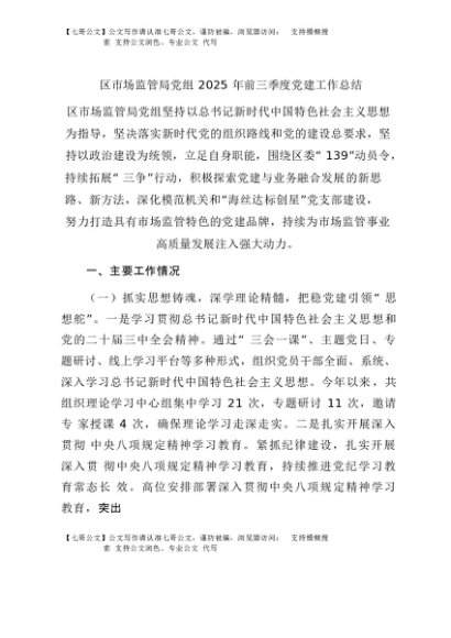 / 【七哥公文】2025年:区市场监管局党组2025年前三季度党建工作总结+更多免费公文+VX:QiGeGongWen2024