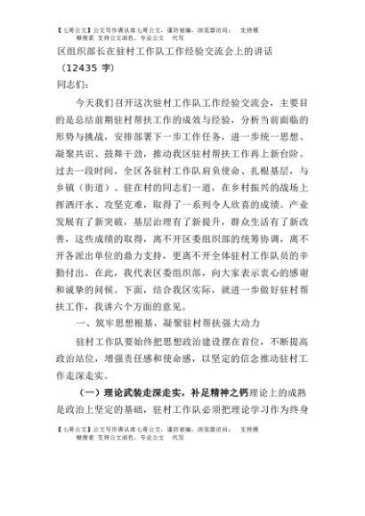 【七哥公文】2025年:区组织部长在驻村工作队工作经验交流会上的讲话(12435字)+更多免费公文+VX:QiGeGongWen2024