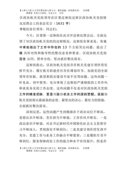 【七哥公文】2025年:区政协机关党组领导在区委巡察组巡察区政协机关党组情况反馈会上的表态发言(1631字)+更多免费公文+VX:QiGeGongWen2024