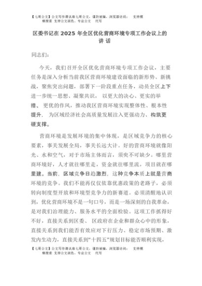 【七哥公文】2025年:区委书记在2025年全区优化营商环境专项工作会议上的讲话+更多免费公文+VX:QiGeGongWen2024